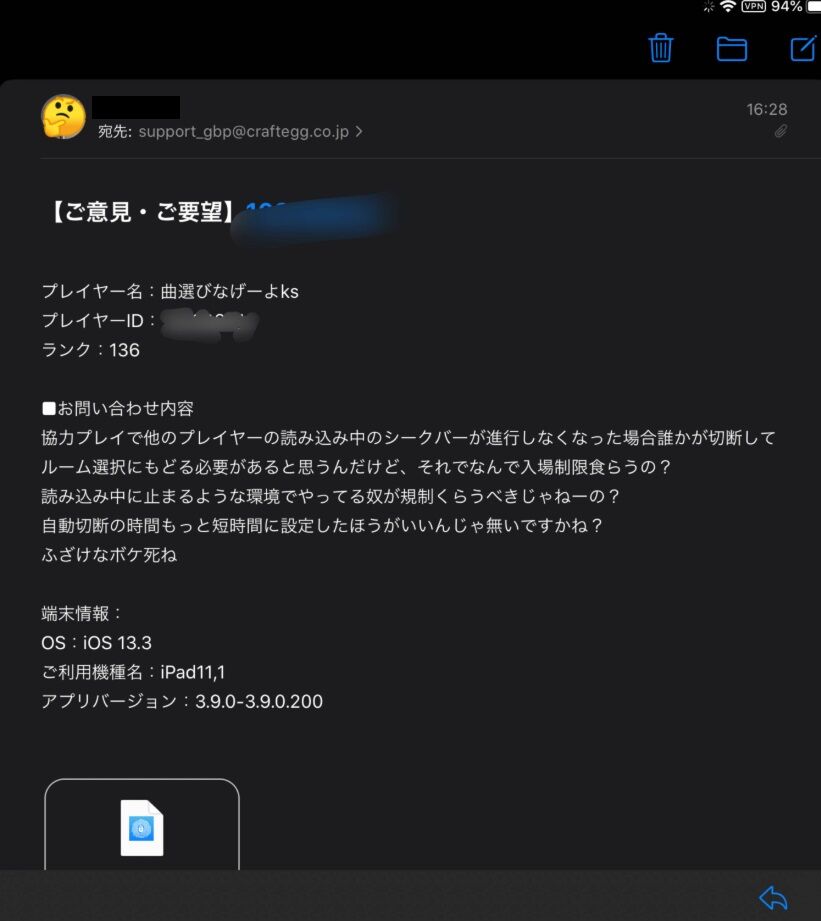 【画像】ソシャゲで問い合わせに暴言送ったんだけどこれBANされる? 2023/12/23 Y速報 " " 1: 12/28(土) 16:45:00.330 ID:UbX7YiLg0 言い過ぎたとは思ってる 続きを読む Source: Y速報