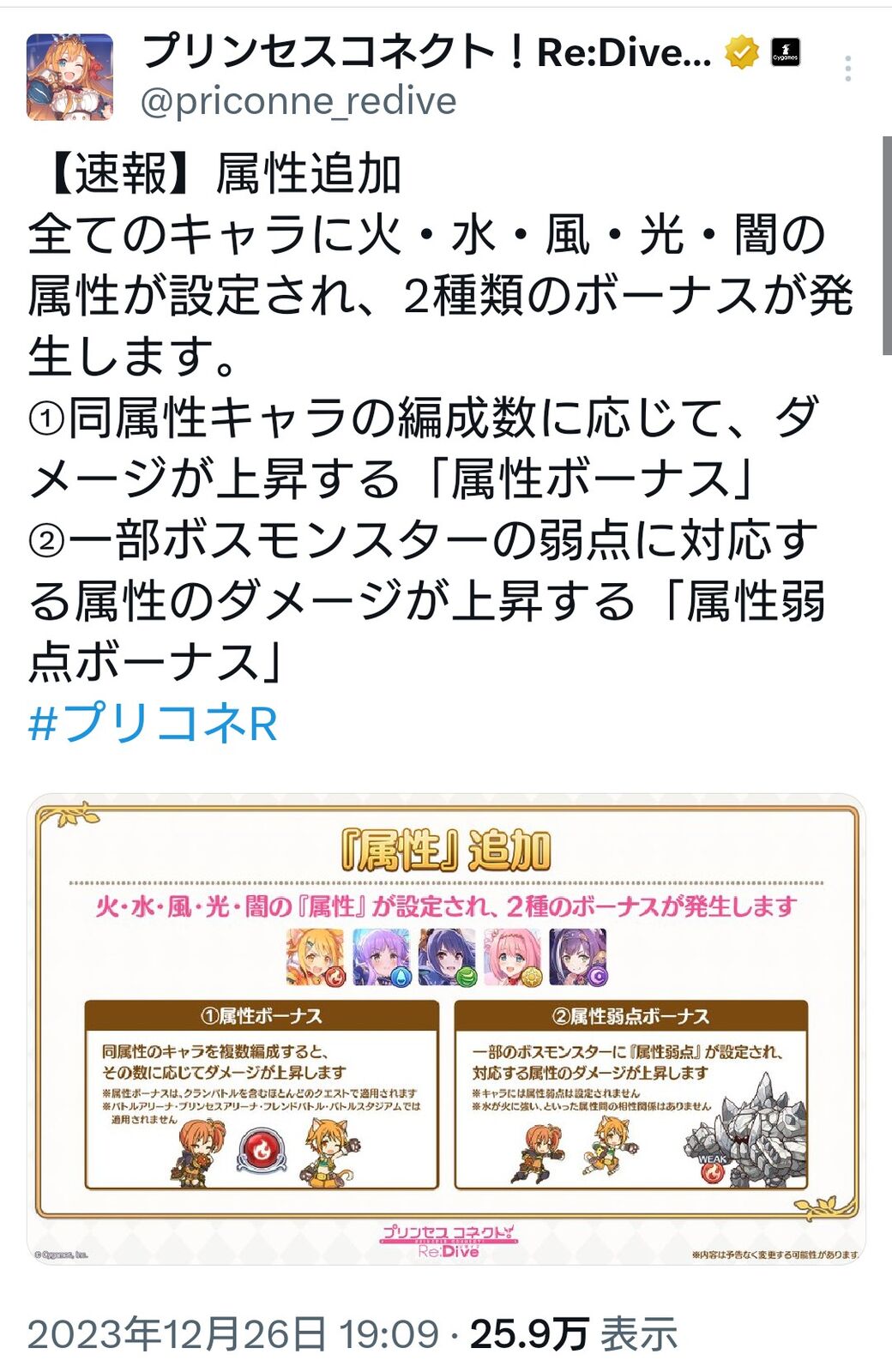 ②一部ボスモンスターの弱点に対応する属性のダメージが上昇する「属性弱点ボーナス」#プリコネR pic.twitter.com/CxYM1daxcQ— プリンセスコネクト!Re:Dive公式 (@priconne_redive) December 26, 2023