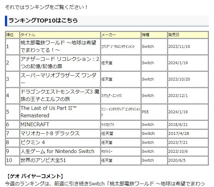 今週のランキングは、前週に引き続きSwitch「桃太郎電鉄ワールド ~地球は希望でまわってる!~」が1位を獲得しました。2位には、新発売のSwitch「アナザーコード リコレクション:2つの記憶/記憶の扉」がランクインしました。本作は、「アナザーコード 2つの記憶」とその続編「アナザーコード:R記憶の扉」を一新し、Nintendo Switchソフトに収録した作品です。