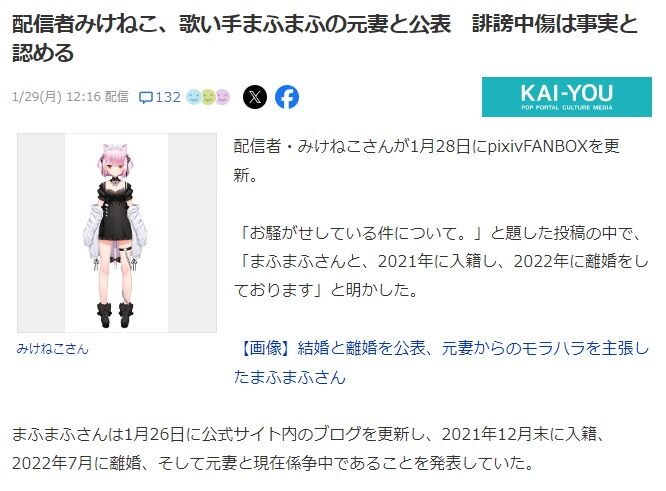 配信者みけねこ、歌い手まふまふの元妻と公表 誹謗中傷は事実と認める