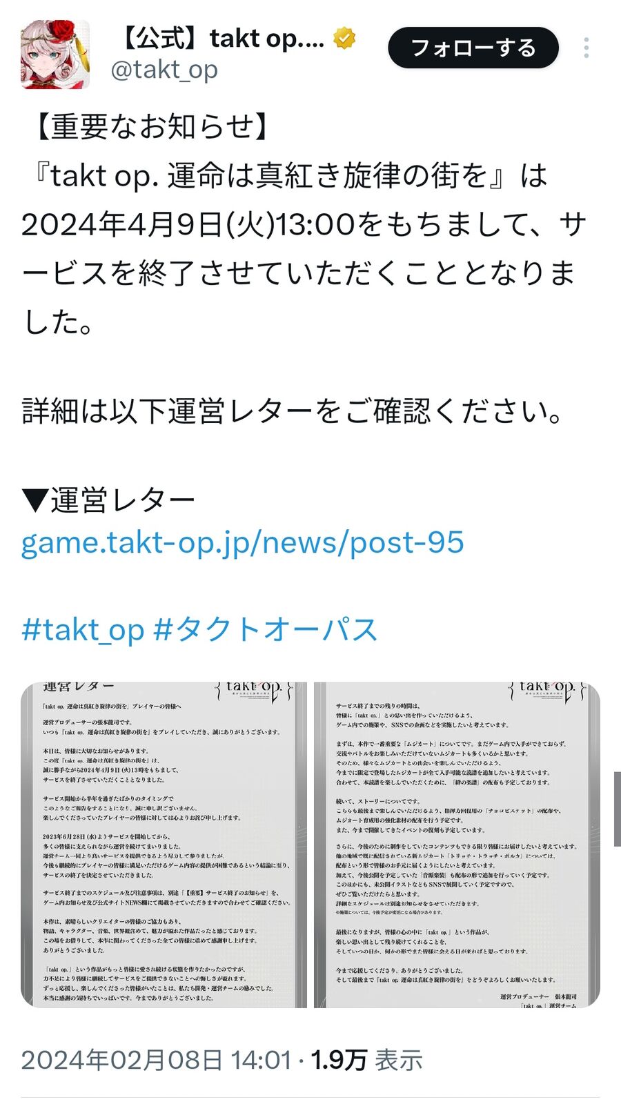 【悲報】あの人気アニメのソシャゲ『takt op. タクトオーパス』、サ終 2024/2/8 Y速報 " " 1: 2024/02/08(木) 14:12:31.32 ID:aDKyGJjwd えっショック 続きを読む Source: Y速報