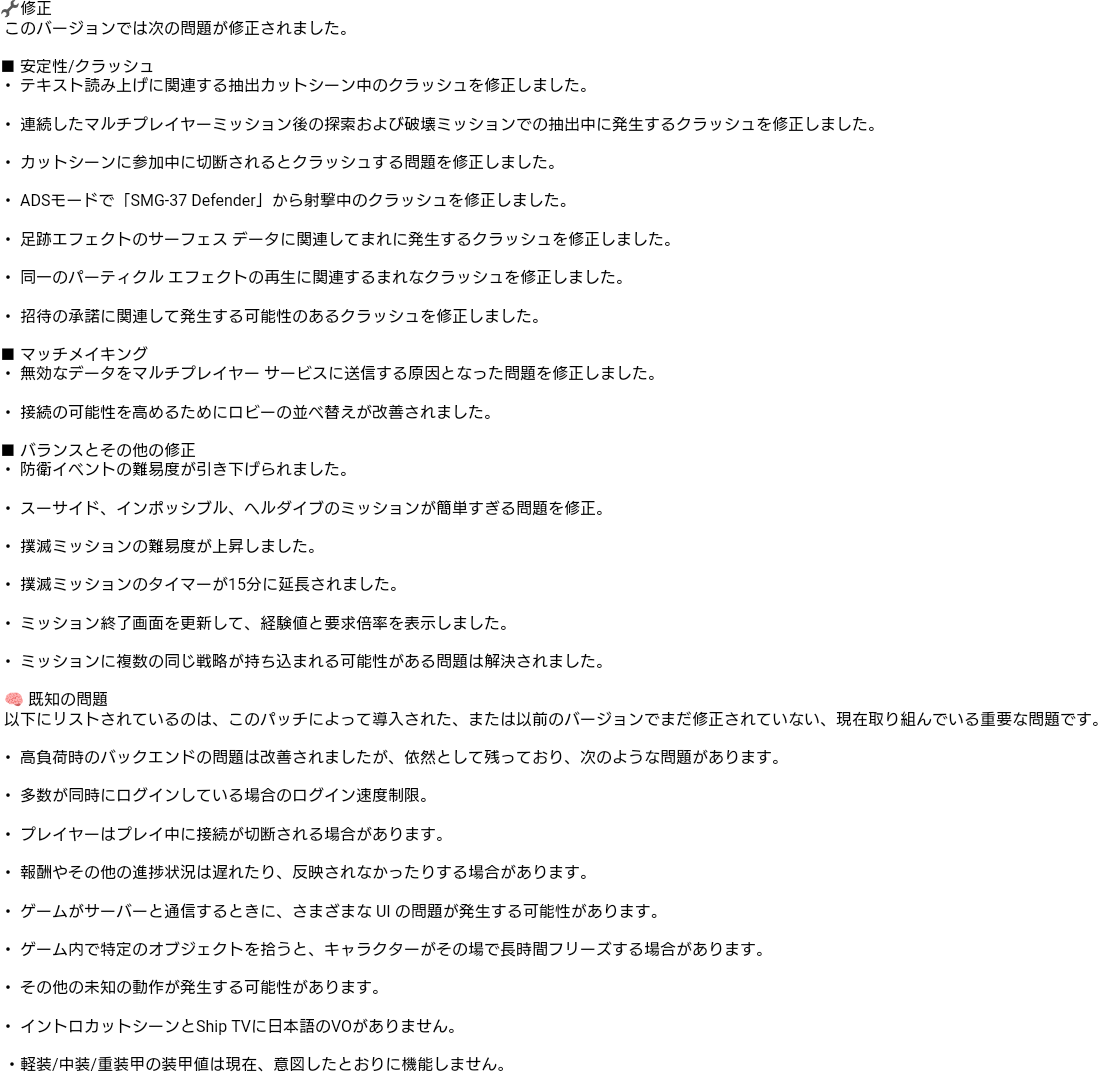 【ヘルダイバー2】アプデの内容翻訳してみた 2024/2/19 Y速報 " " 487: 2024/02/17(土) 20:05:40.12 ID:hKYV21LO0 公式XにあったSteamのパッチノートを翻訳してみた 長いから画像でごめん 続きを読む Source: Y速報