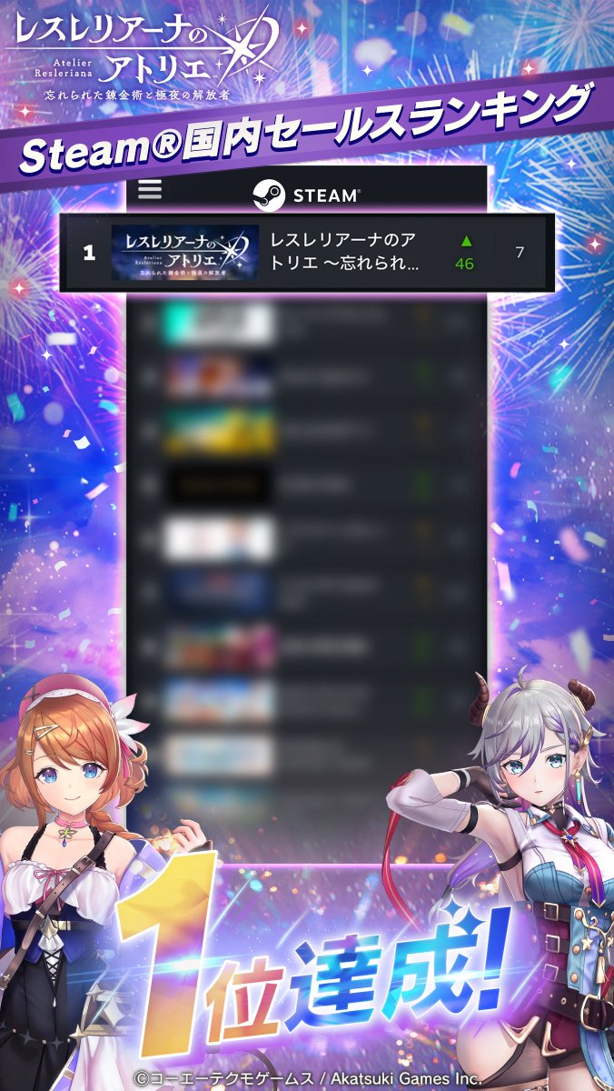 おかげさまで『#レスレリアーナのアトリエ』はSteam®︎の国内セールスランキングで1位を達成いたしました🎉