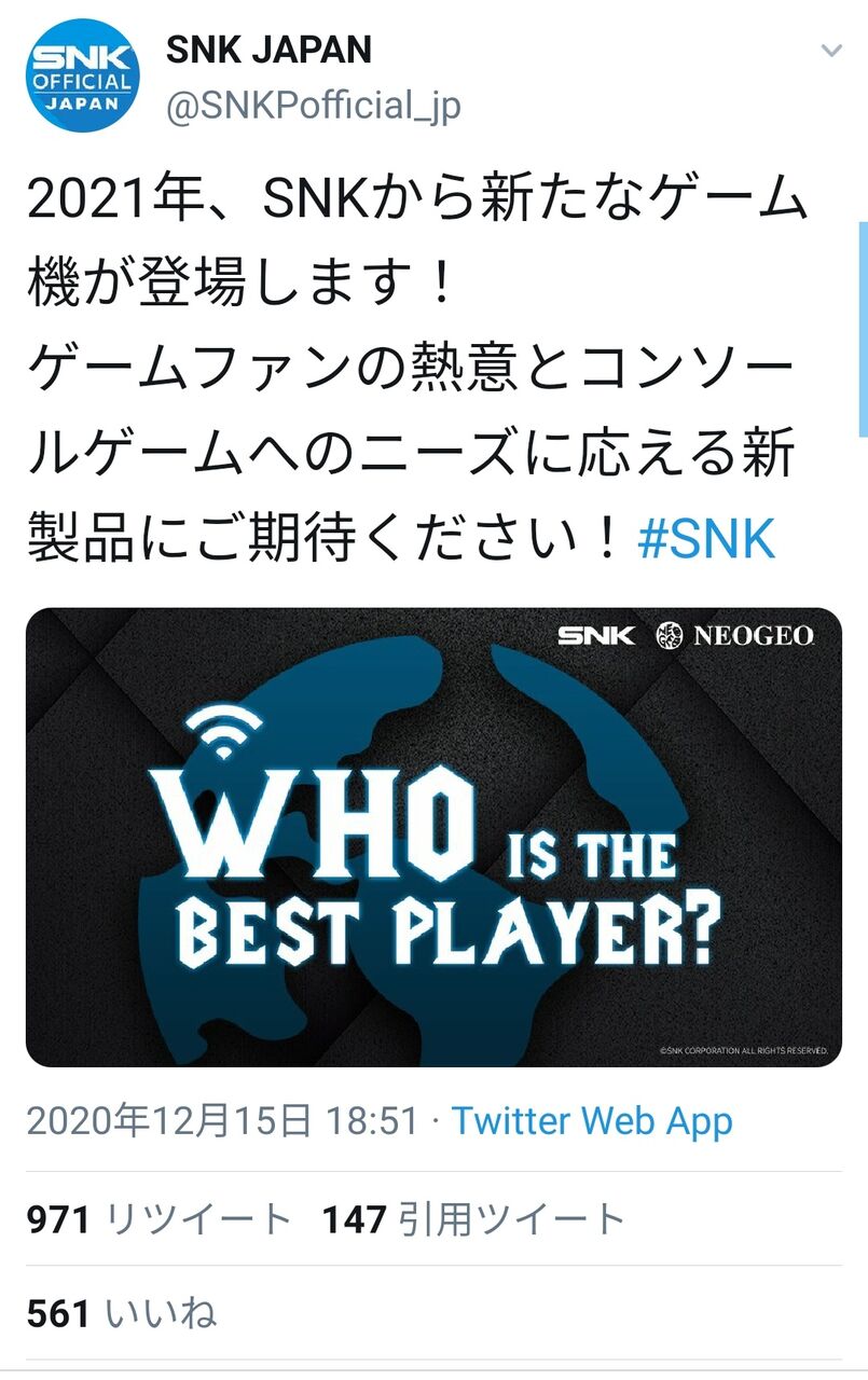 ゲームファンの熱意とコンソールゲームへのニーズに応える新製品にご期待ください!#SNK pic.twitter.com/DDdQZbs0Bk— SNK JAPAN (@SNKPofficial_jp) December 15, 2020