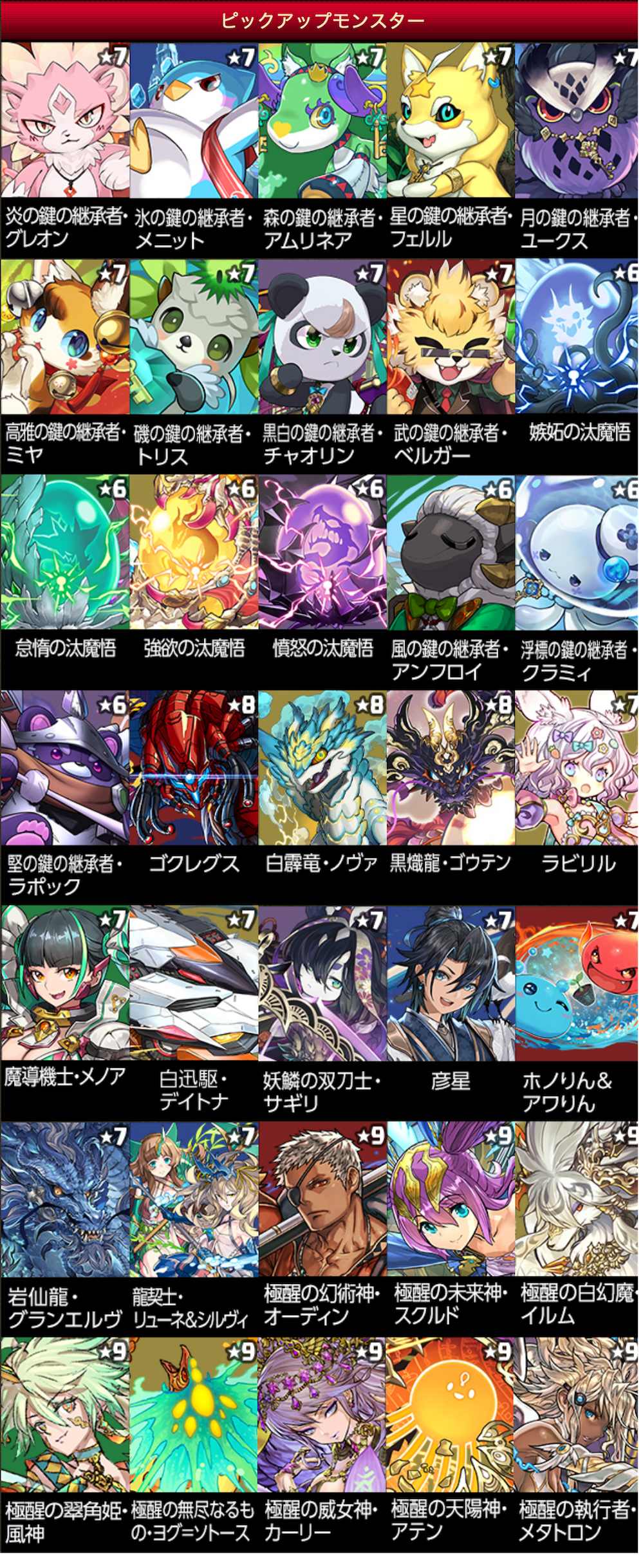 ※03/30(土)12:00~04/02(火)23:59の期間中開催される「魔法石10個!イースタースーパーゴッドフェス」と同じモンスターが出現しますが、的中確率は異なります。