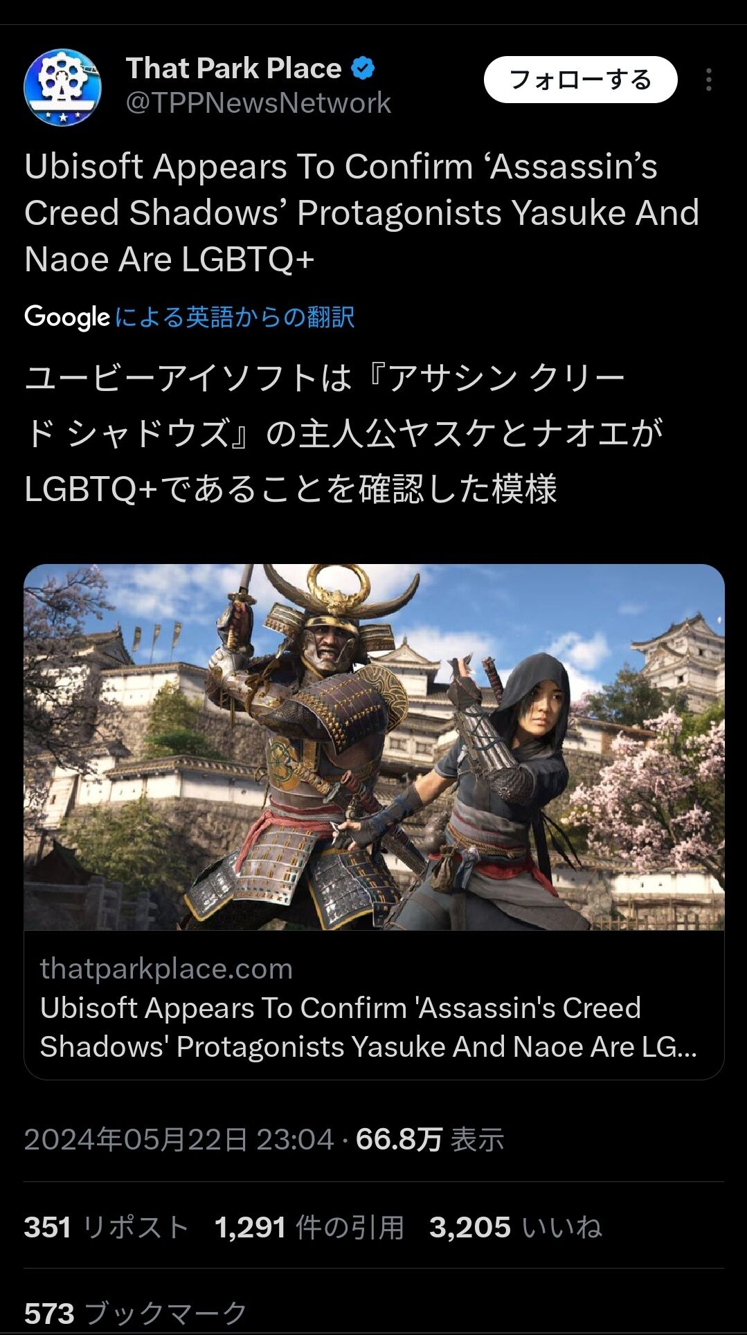 アサクリシャドウズ弥助とナオエ、LGBTQという設定に 2024/5/23 Y速報 " " 1: 2024/05/23(木) 12:26:48.41 ID:Qb/yJDlH0 うひ 続きを読む Source: Y速報