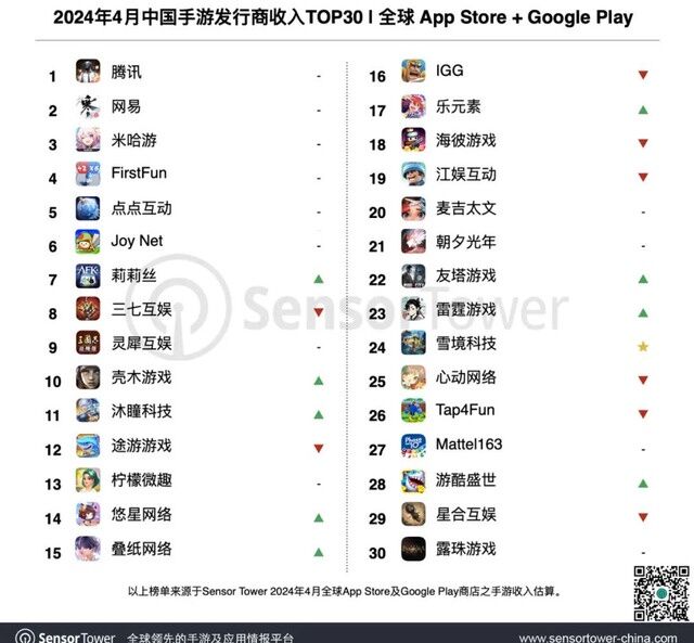 米調査会社センサータワーがこのほど、2024年4月のモバイルゲームパブリッシャー売上高ランキング(App StoreとGoogle Play)の上位100社を発表した。中国企業は39社ランクインし、売上高の合計は20億7000万ドル(約3250億円)と上位100社の40.2%を占めた。中国企業のトップ3は、テンセント(騰訊)、ネットイース(網易)、miHoYo(米哈遊)の順だった。FirstFunは「ラストウォー:サバイバル」の快進撃で4位に入った。