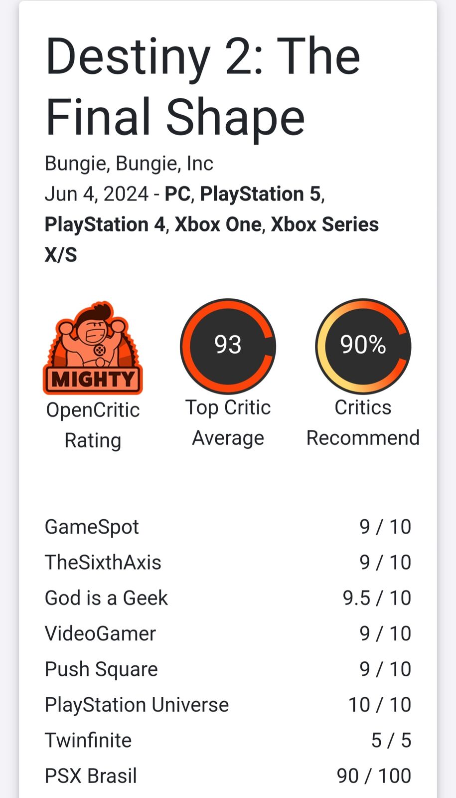 Destiny 2: The Final Shape オープンスコア93と神ゲー評価 2024/6/13 Y速報 " " 1: 2024/06/12(水) 00:13:10.19 ID:wZSiA0lb0 https://opencritic.com/game/16054/destiny-2-the-final-shape 続きを読む Source: Y速報