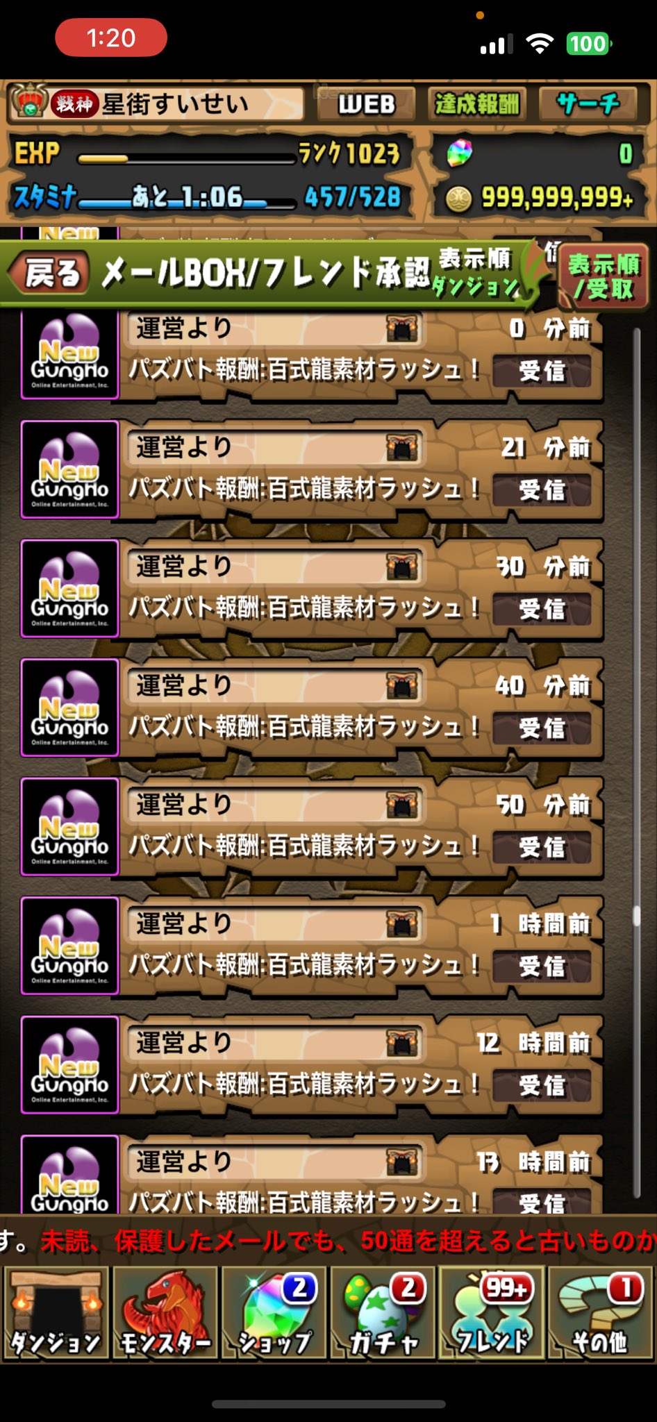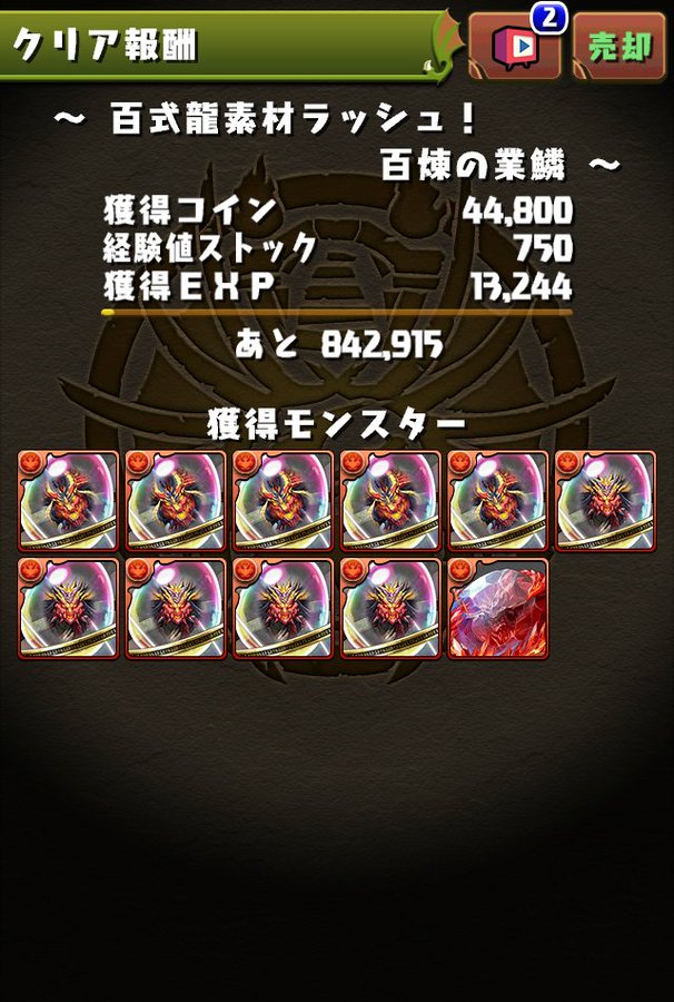 1ダンジョンにつき交換素材が5体ずつ入手できるためビャクレンコウ交換には10回クリアする必要がある=虹ドロップ1000個、火ドロップ2500個