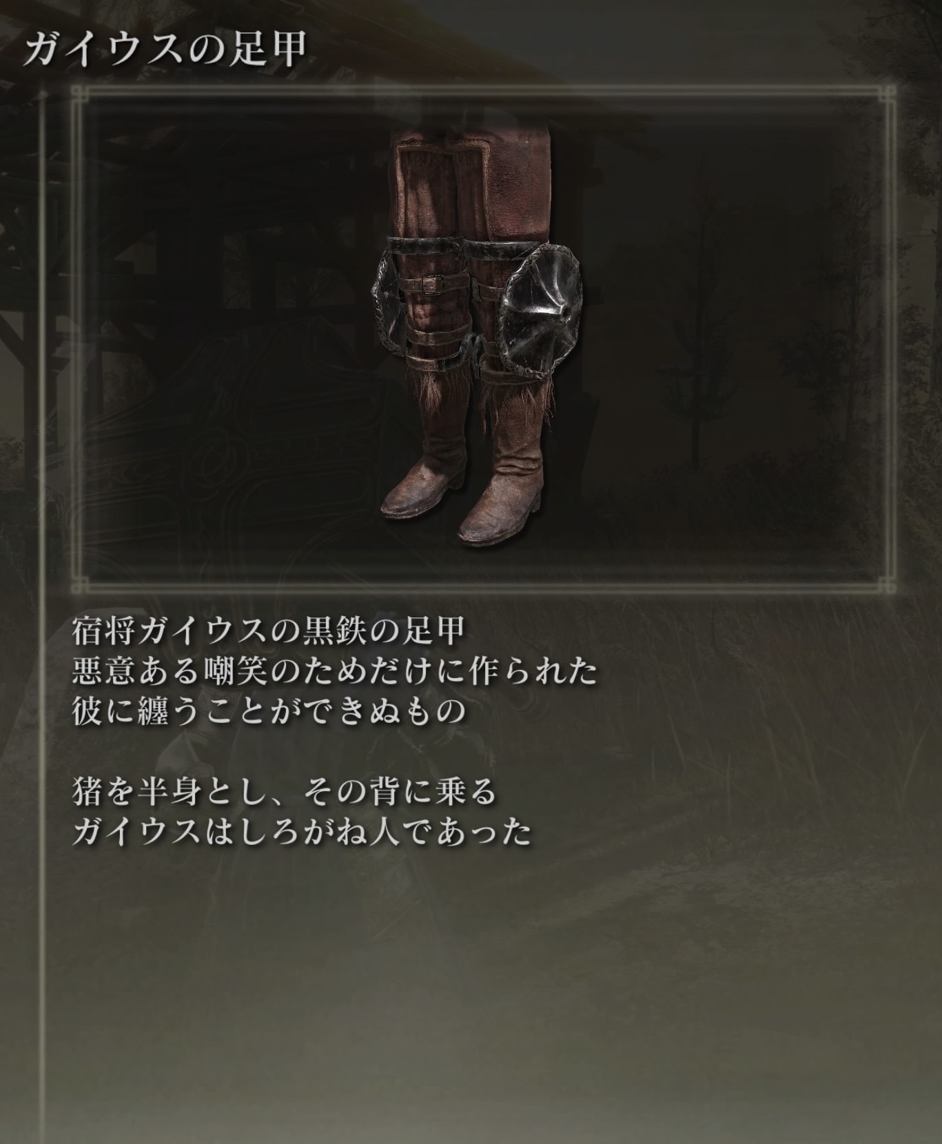 【エルデンリング】ガイウスの足甲の説明ほんと草 2024/6/28 ダークソウルまとめ速報 " " 55: ID:GBseqfnmd.net これほんと草 宿将ガイウスの黒鉄の足甲悪意ある嘲笑のためだけに作られた彼に纏うことができぬもの 猪を半身とし、その背に乗るガイウスはしろがね人であった 続きを読む Source: ダークソウルまとめ速報