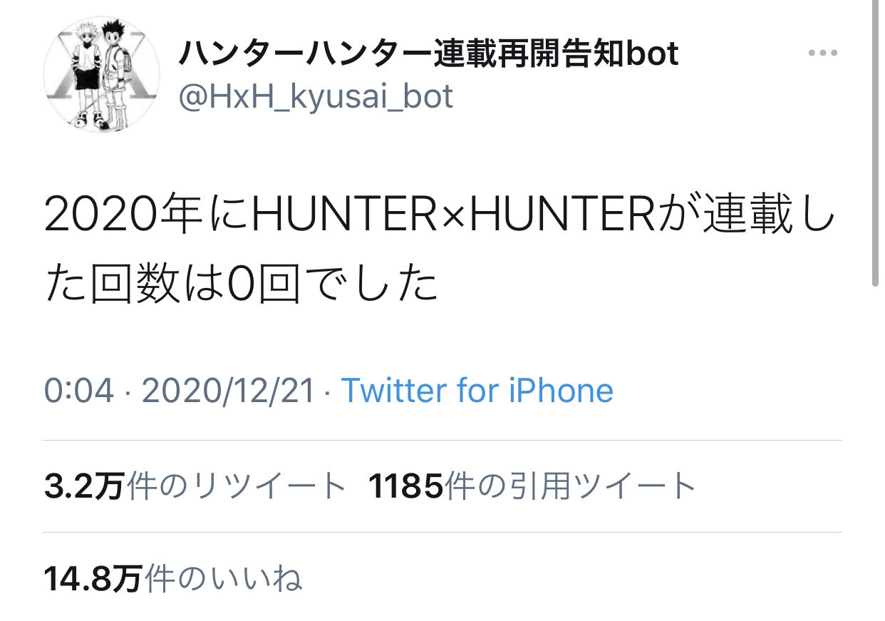 【悲報】HUNTER × HUNTERさん、ついに一度も連載を再開することなく2020年を終えてしまう… 2020/12/25 Y速報 " " 1: 2020/12/21(月) 22:40:09.38 ID:WjvuP+EVd 悲しいなあ 続きを読む Source: Y速報