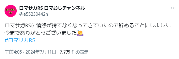 【ロマサガRS】Youtubeで攻略動画を配信しているユーザーの方が引退か… 2024/7/12 ロマサガRS攻略まとめ " " 270 名前ボストン速報:2024/07/11(木) 09:29:11.51 ID:h81 ロマおじさんも引退かただ、並べるだけになっちゃったし、今の状況で使ってみたなんて出されてもね… 続きを読む Source: ロマサガRS攻略まとめ