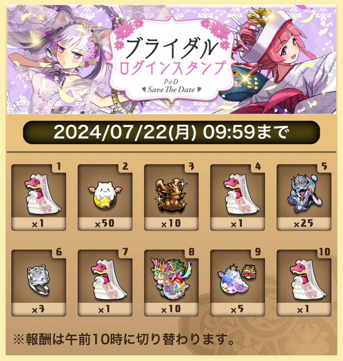 【パズドラ速報】ブライダルガチャ配布開始キタ━(゚∀゚)━!!【ログインスタンプ10日目】 2024/7/17 オーガch.-パズドラ攻略まとめ速報 " " ブライダルログインスタンプ実施! 期間:07/08(月)10:00~07/22(月)09:59 期間限定の特別なログインスタンプを実施! 「ブライダルガチャ」など、期間中のログイン日数に応じた報酬がゲーム内メールに届くぞ! 続きを読む Source: オーガch.-パズドラ攻略まとめ速報