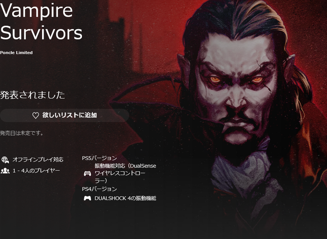 『Vampire Survivors』は全方位から現れる敵をなぎ倒して経験値を集めパワーアップするアクションゲームで、以後多数のフォロワー作品を産みだした、言わずと知れた傑作です。家庭用コンソール向けにはスイッチおよびXbox Series X|S・Xbox Oneに移植されていましたが、PS5・PS4向けには今年4月の時点で「2024年夏配信予定」と告知されているのみでした。