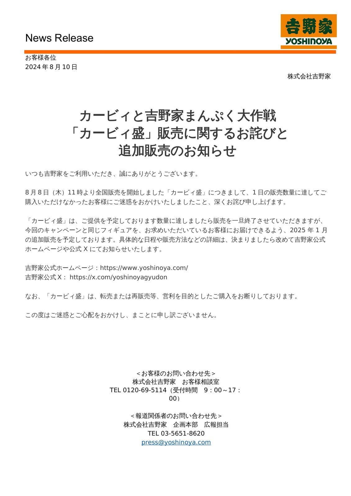 カービィと吉野家まんぷく大作戦 「カービィ盛」販売に関するお詫びと追加販売のお知らせ 2024/8/11 Y速報 " " 1: 2024/08/10(土) 11:11:43.03 続きを読む Source: Y速報