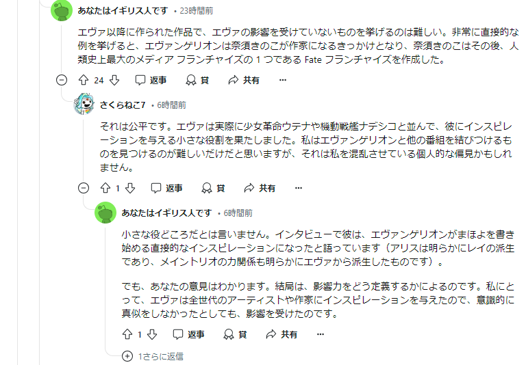 「エヴァンゲリオンは奈須きのこが作家になるきっかけとなり、奈須きのこはその後、人類史上最大のメディア フランチャイズの 1 つである Fate フランチャイズを作成した。」