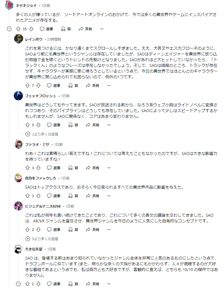 「SAOはトップクラスであり、おそらく今日見られるすべての異世界作品に影響を与えた。」