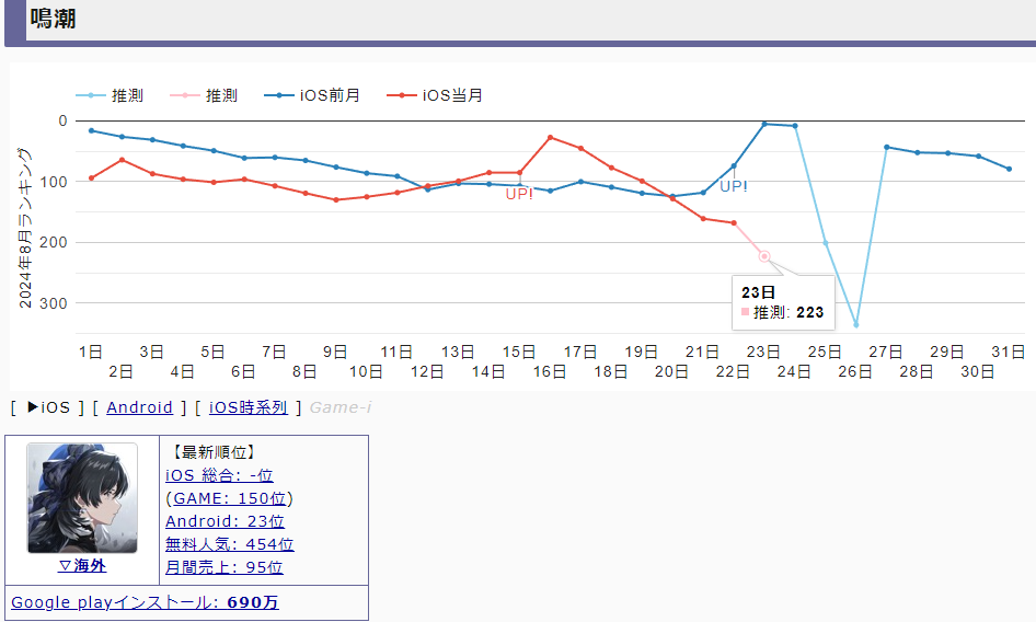 鳴潮、早くもセルラン圏外へ ユーザーの取り合いが原因か 2024/8/24 Y速報 " " 1: 2024/08/22(木) 22:17:00.07 ID:9MDSuKkk0 https://game-i.daa.jp/?APP/6475033368 脅威の右肩下がり 続きを読む Source: Y速報