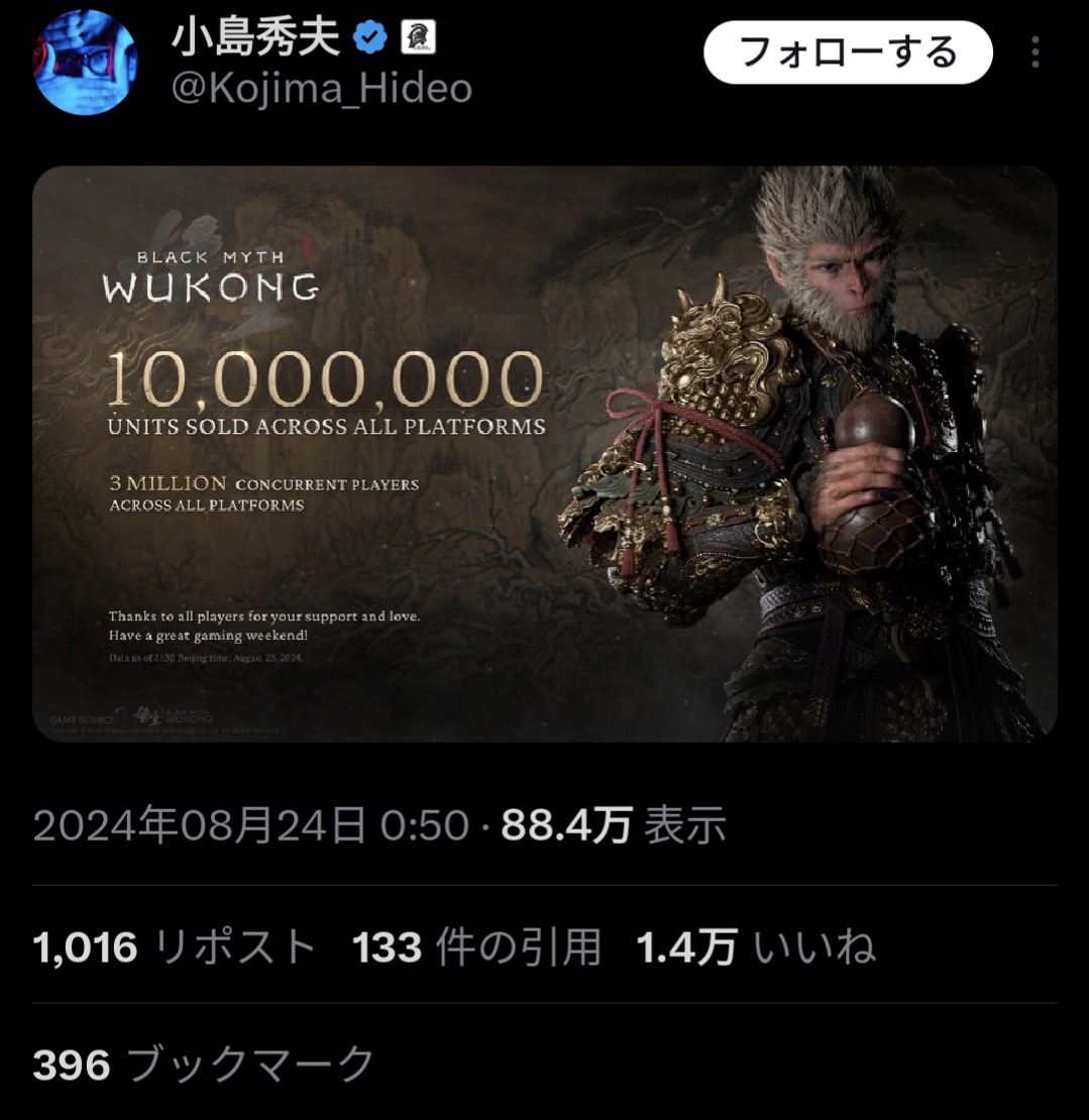 【朗報】今話題のゲーム『黒神話:悟空』、発売4日目にして売上1000万本を突破、小島監督も祝福 2024/8/24 ダークソウルまとめ速報 " " 1: ID:zEEpcAx90.net 覇権では? 続きを読む Source: ダークソウルまとめ速報