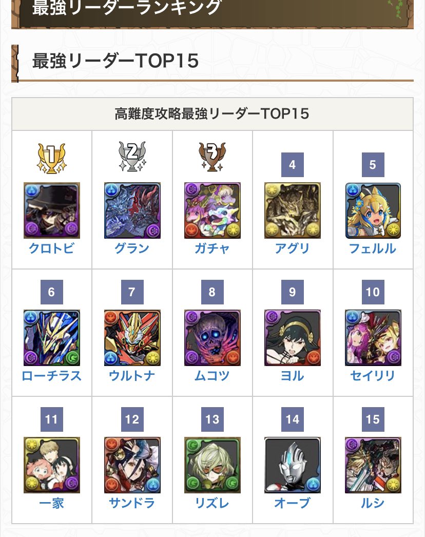 ちょうど1年前の最強リーダーランキング貼っときます pic.twitter.com/rZ1nv0VlEC