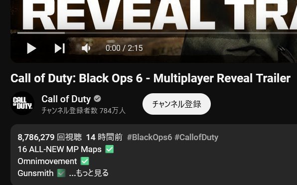 【覇権】シリーズ大本命「CoD:BO6」トレーラー、たった14時間で870万再生突破ww 2024/8/30 Y速報 " " 1: 2024/08/27(火) 14:00:38.20 ID:xZBB+9ux0 まさに桁違い https://youtu.be/GYG_h-L-K2E 続きを読む Source: Y速報