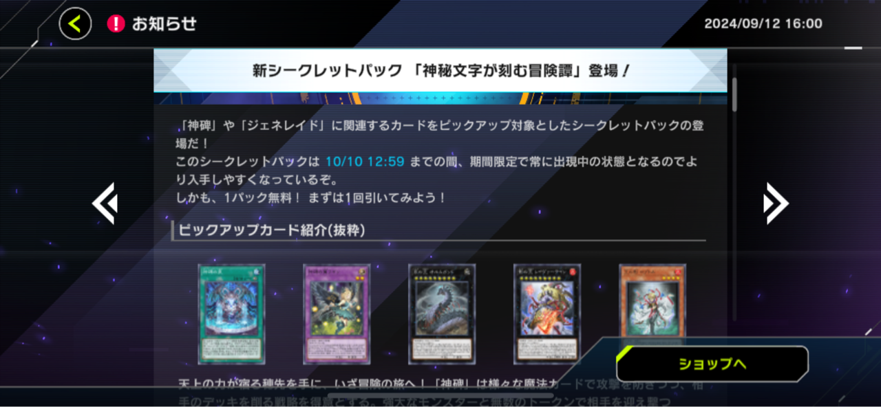 【速報】新シークレットパック「神秘文字が刻む冒険譚」「歓喜に満たされし新世壊」追加 2024/9/12 遊戯王デュエルリンクス超速報! " " 続きを読む Source: 遊戯王デュエルリンクス超速報!