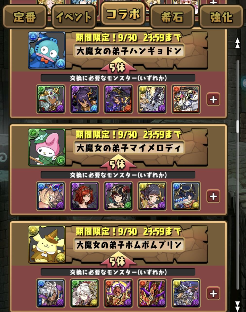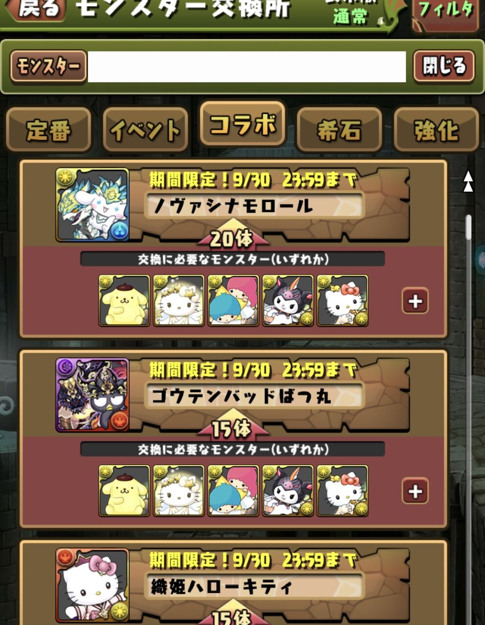 【パズドラ速報】「ゴウテンばつ丸」「オリィKIRIMI」「ヴェロアキティ」など交換可能キタ━(゚∀゚)━!!【公式】 2024/9/16 オーガch.-パズドラ攻略まとめ速報 " " 弾20体:ノヴァシナモロール弾15体:ゴウテンばつ丸、織姫キティ、アトリキティ、オリィKIRIMI 弾5体:ゼラキティ、マドゥキティ、リーチェキティ、サレーネキティ、ヴェロアキティ、レムゥキティ、ノルザキティ、アルジェキティ、ファスカキティ、ネレキティ、チェルンハンギョドン、チャコルマイメロディ、ドーナポムポムプリン、ポンノクロミ 続きを読む Source: オーガch.-パズドラ攻略まとめ速報