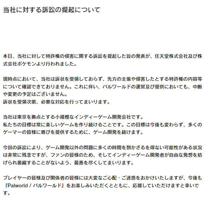 ゲーム『パルワールド』を開発・販売するポケットペアは19日、ポケモンと任天堂より提訴されたことを受け、声明文を出した。