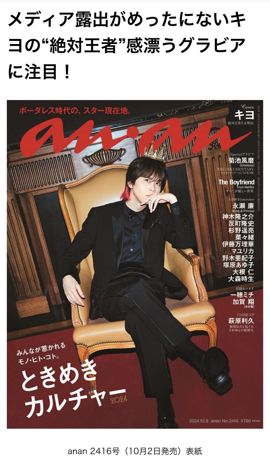 【朗報】ゲーム実況者キヨ「anan」表紙になる 2024/9/24 Y速報 " " 1: 2024/09/24(火) 00:16:48.90 ID:jXDYO/aV0 単独東京ドーム公演を控えるゲーム実況者、キヨが活動15周年の記念すべき年にananの表紙に“絶対王者”の風格で降臨! anan2416号「ときめきカルチャー2024」特集。10月2日 (水) 発売。 続きを読む Source: Y速報