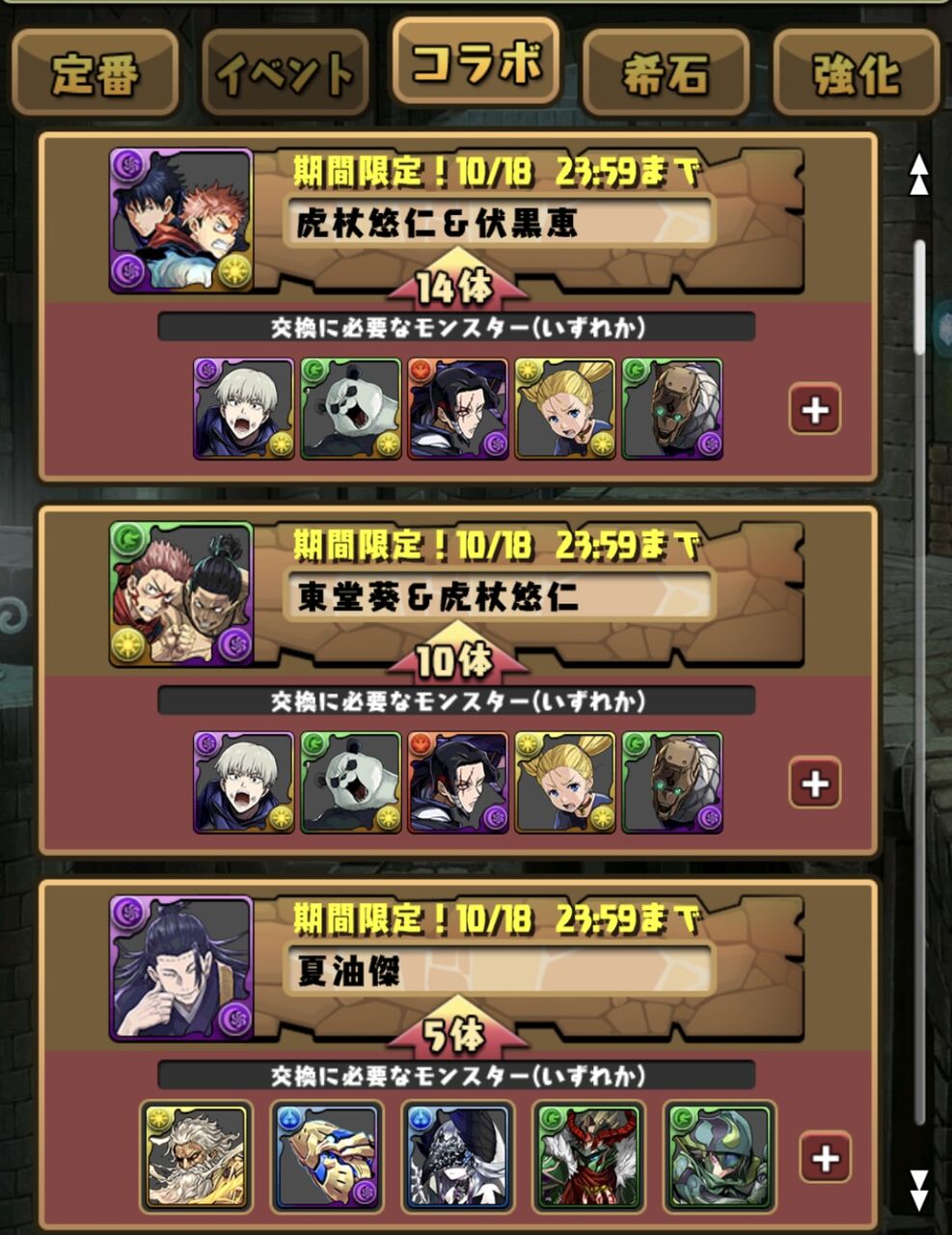 【パズドラ速報】呪術廻戦コラボ2024開幕!夏油傑交換可能キタ━(゚∀゚)━!!【公式】 2024/10/1 オーガch.-パズドラ攻略まとめ速報 " " 弾14体:虎杖悠仁&伏黒恵 弾10体:東堂葵&虎杖悠仁 弾5体:夏油、五条悟(旧)、虎杖悠仁 続きを読む Source: オーガch.-パズドラ攻略まとめ速報