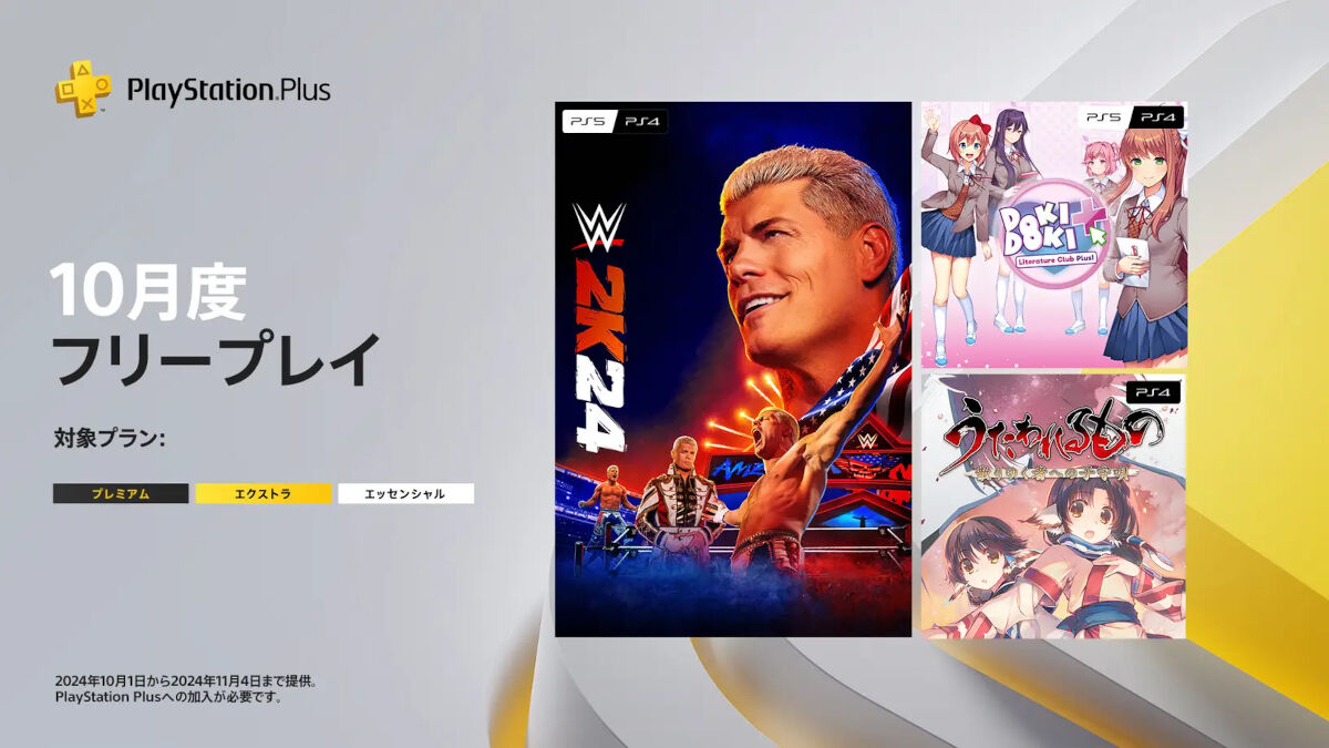 10/1本日~PSPlus10月フリープレイ提供開始!『WWE 2K24』『うたわれるもの 散りゆく者への子守唄』など3タイトル 2024/10/1 PS5速報! " " 10/1本日より PSPlus「10月度フリープレイ」にて 以下の3タイトルが提供開始です! ・『WWE 2K24』 ・『うたわれるもの 散りゆく者への子守唄 ・『ドキドキ文芸部プラス!』 続きを読む Source: PS4速報!