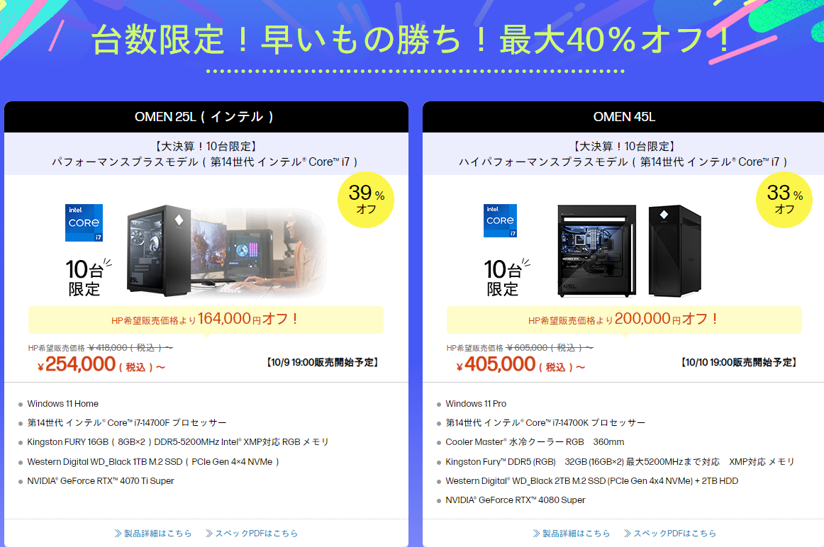10/9(水)の19時よりHP公式サイトにて、RTX 4070 Ti SUPER / Core i7-14700F / 16GBメモリー / 1TB SSD搭載の「OMEN 25L」が25万4000円で販売されます。同構成の他社製品なら、安くても30万円前後が一般的。25万円台はお買い得です。