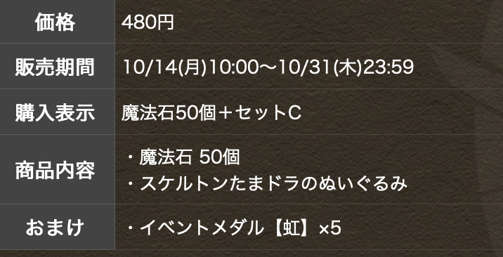 【パズドラ】「ハロウィンスペシャルセット」販売キタ━(゚∀゚)━!!【超ウルトラお得】 2024/10/14 オーガch.-パズドラ攻略まとめ速報 " " 480円で「魔法石50個」や「スケルトンたまドラのぬいぐるみ」などが入手できる、超ウルトラお得な「ハロウィンスペシャルセット」を魔法石ショップにて販売! また、「スケルトンたまドラのぬいぐるみ」は能力調整されるぞ! 続きを読む Source: オーガch.-パズドラ攻略まとめ速報