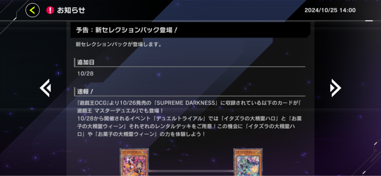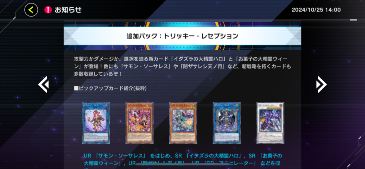 【速報】新パック「トリッキー・レセプション」を10/28追加 「サモン・ソーサレス」きたあああ!!! 2024/10/25 遊戯王デュエルリンクス超速報! " " 続きを読む Source: 遊戯王デュエルリンクス超速報!