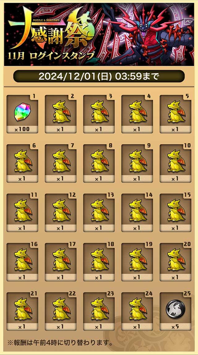 11月は魔法石100個、スーパーゴッドフェスガチャ合計23回、イベントメダル【黒】×5がゲットできるチャンス!