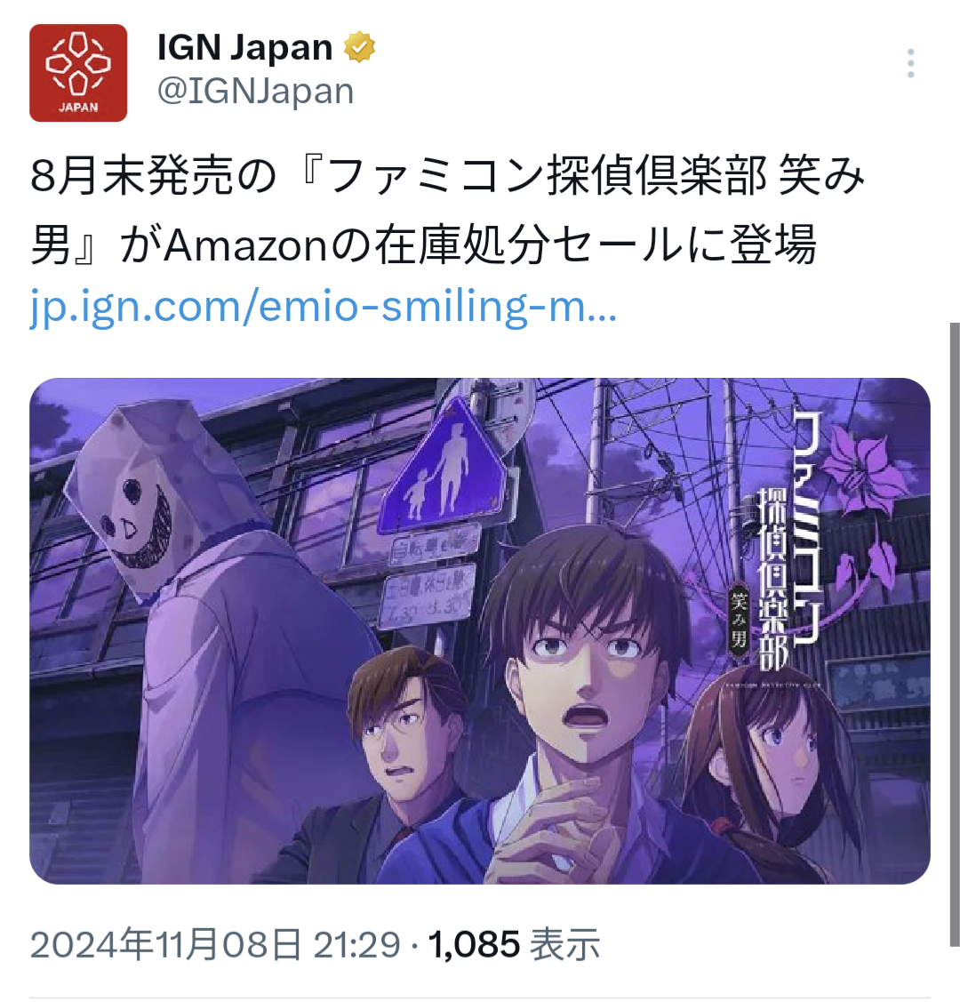 【悲報】「ファミコン探偵倶楽部 笑み男」Amazonで在庫処分 2024/11/9 Y速報 " " 1: 2024/11/08(金) 21:38:52.32 ID:f8AgDVHJ0 どうして・・・ 続きを読む Source: Y速報