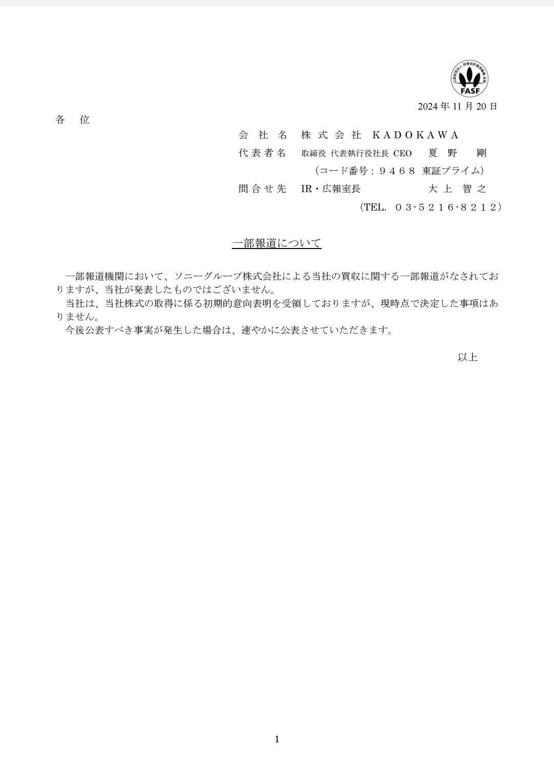 KADOKAWA、お気持ち表明 2024/11/21 Y速報 " " 1: 2024/11/20(水) 21:02:48.23 ID:dEajdWQu0HAPPY https://ssl4.eir-parts.net/doc/9468/tdnet/2532756/00.pdf 続きを読む Source: Y速報