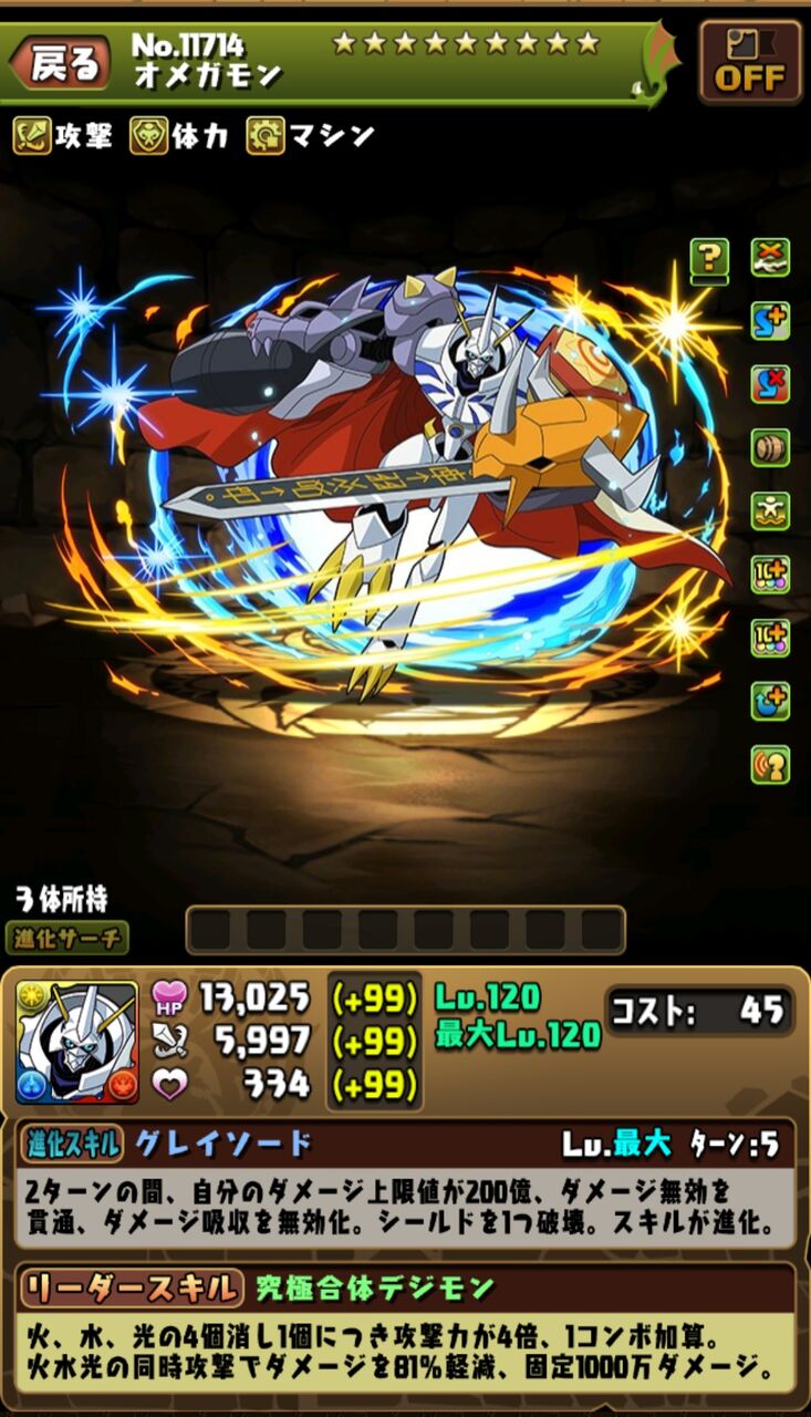 どれくらい強いかというと、オメガモンの編成を組めればそれ以降のガチャは回さなくてもいいってくらい強い