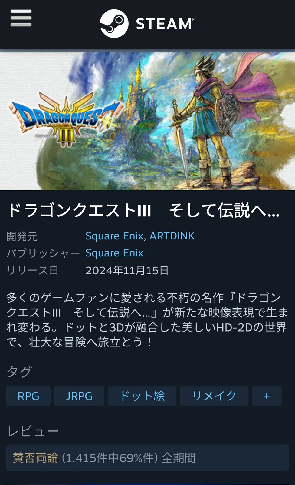 ドラクエ3リメイク、steam評価がついに賛否両論まで落ちてしまう 2024/11/24 Y速報 " " 1: 2024/11/24(日) 08:11:57.21 ID:dyXI0agI0 どおして… 続きを読む Source: Y速報