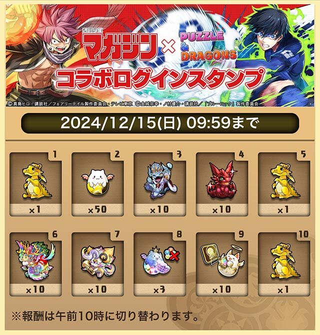 【マガジンコラボ】最後のログボガチャ解禁キタ━(゚∀゚)━!!【パズドラ】 2024/12/10 オーガch.-パズドラ攻略まとめ速報 " " 「週刊少年マガジン」コラボ ログインスタンプ実施! 期間: 12/01(日)10:00~12/15(日)09:59 「週刊少年マガジン」コラボ期間中、特別なログインスタンプを実施! 「週刊少年マガジンガチャ」など、期間中のログイン日数に応じた報酬がゲーム内メールに届くぞ! 続きを読む Source: オーガch.-パズドラ攻略まとめ速報