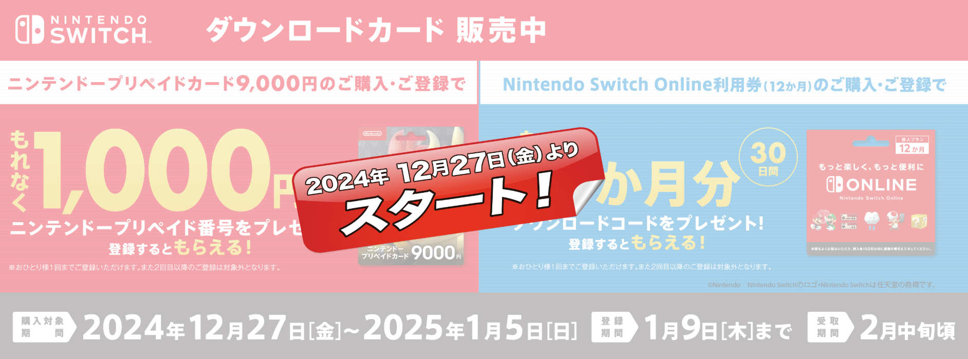【任天堂】コンビニエンスストアでお得なキャンペーンを実施! 2024/12/27 Y速報 " " 1: 2024/12/26(木) 10:22:54.41 ID:nEJtthCY0 セブン‐イレブン、ファミリーマート、ローソンで、以下の期間に対象券面のニンテンドープリペイドカードを購入し、特設サイトに登録すると、もれなくニンテンドープリペイド番号がもらえるキャンペーンを実施いたします。 続きを読む Source: Y速報