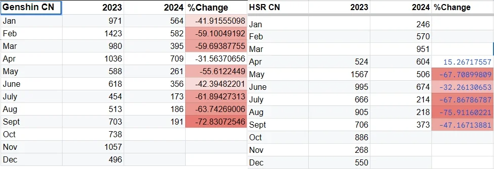 ・原神の売上(1月~9月)は2023年と比較し‐53%減少