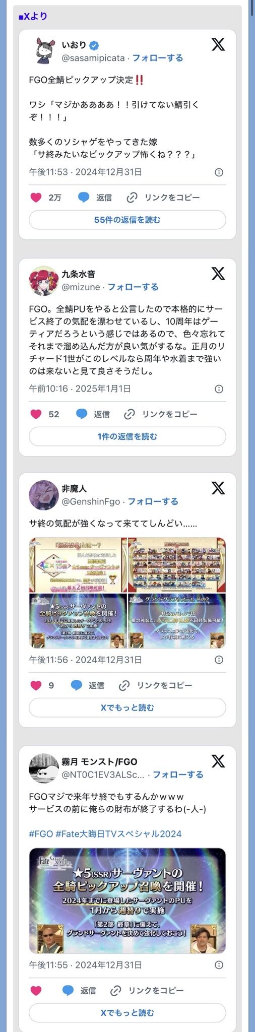 【悲報】FGOさん、ガチでサービス終了しそうだと話題に…… 2025/1/5 ゲーム実況者速報 " " 1: ゲーム実況者速報 2025/01/05(日) 16:17:55.094 ID:NbFfgDQH0 年末特番で全キャラ復刻ガチャ&ストーリー完結編開幕を大々的に発表 しかしユーザーの間でサ終の雰囲気が漂いだす事態に… 続きを読む Source: ゲーム実況者速報