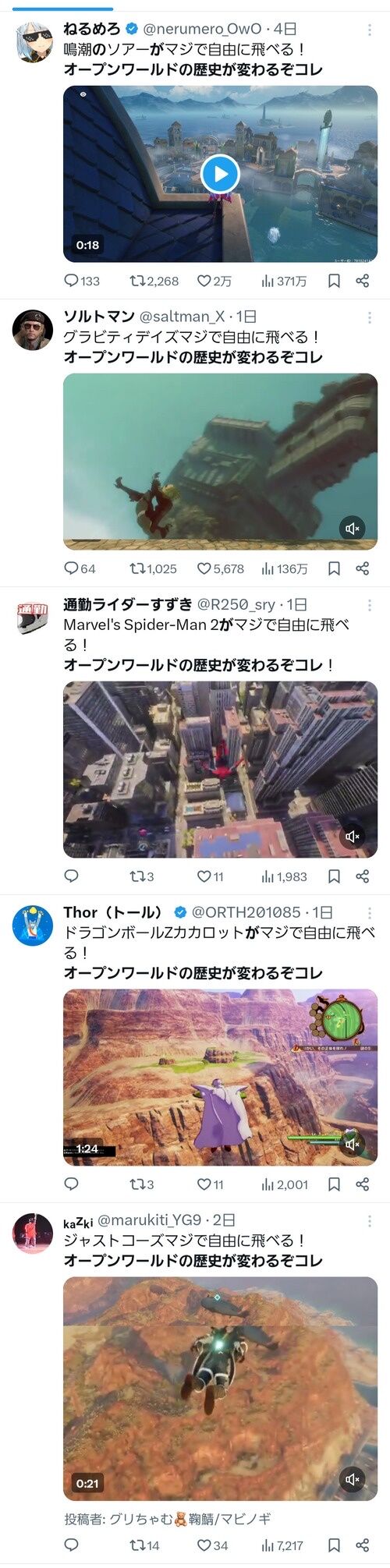 原神系ユーチューバーさん、鳴潮をやって衝撃を受ける「まさか空を飛べるなんてオープンワールドの歴史が変わる!」→ゲーマーから総ツッコミwwwwwwwwww 2025/1/7 ゲーム実況者速報 " " 1: ゲーム実況者速報 2025/01/07(火) 01:28:01.18 ID:iw7nsueF0 「オープンワールドの歴史が変わる」がトレンド入り 任天堂はファミコンゲームボーイの時代から空飛べるんだよなぁ 原神は空すら飛べない… 続きを読む Source: ゲーム実況者速報
