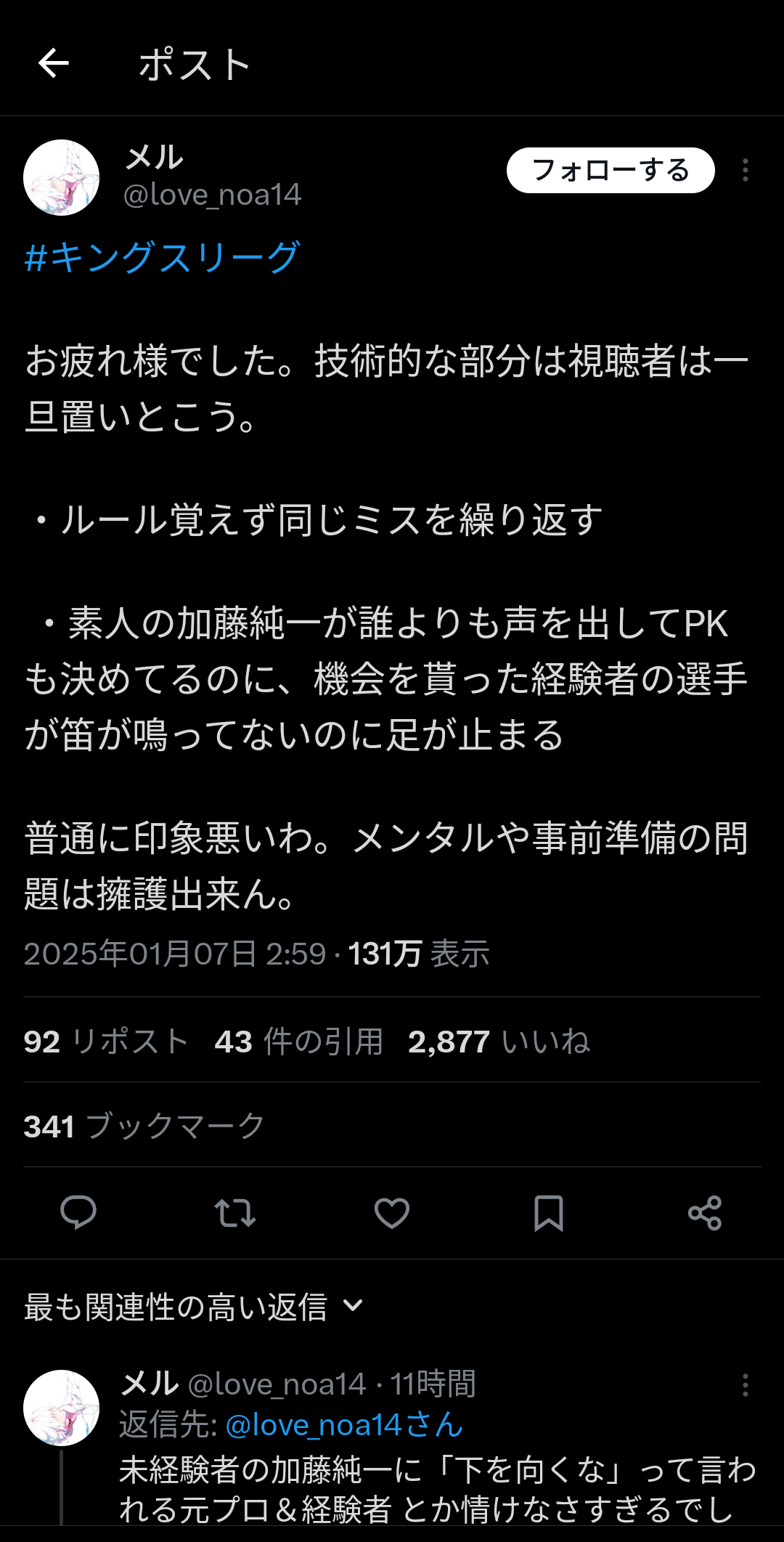 【画像】13%の最底辺蛆虫、キングスリーグ敗退で加藤純一を叩けないので選手を叩き始める 2025/1/9 ゲーム実況者速報 " " 601: ゲーム実況者速報 2025/01/07(火) 14:53:27 ID:PKs6YYG600 既に選手達は叩かれてるよ 続きを読む Source: ゲーム実況者速報