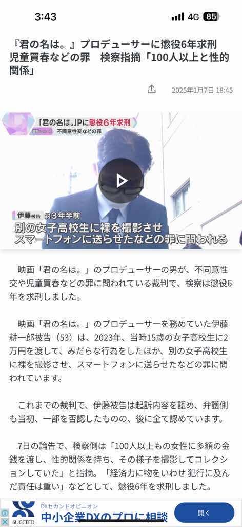 『君の名は。』プロデューサーに懲役6年求刑 児童買春などの罪 100人以上と性的関係 2025/1/10 Y速報 " " 1: 2025/01/09(木) 03:44:07.03 ID:0LEey9O90 画像 https://news.ntv.co.jp/n/ytv/category/society/ytfa5c5d88935e4e3cbda706c1f698825c 続きを読む Source: Y速報