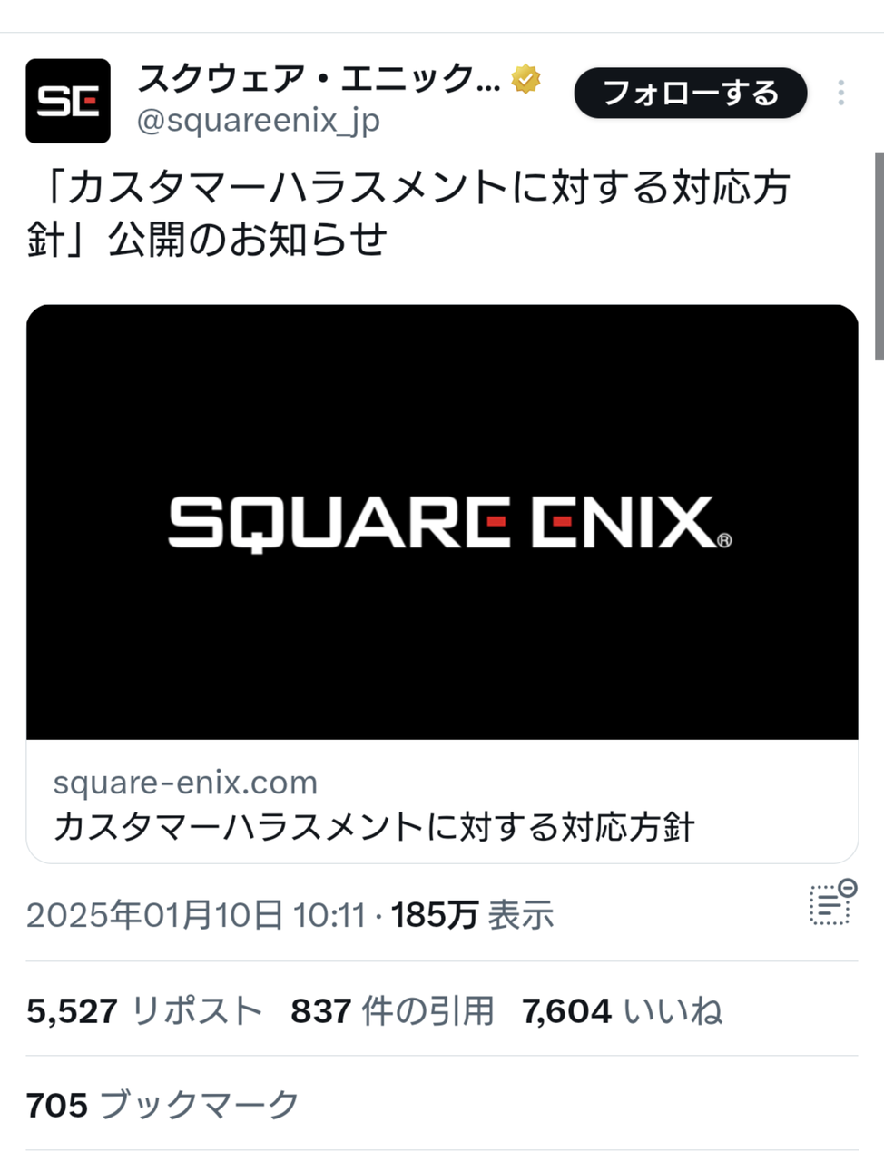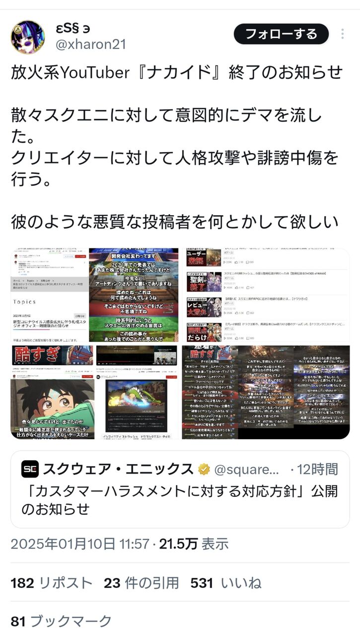 【悲報】スクエニ系ユーチューバーさん、スクエニのカスハラ対策により終わりそう…… 2025/1/11 ゲーム実況者速報 " " 1: ゲーム実況者速報 2025/01/10(金) 22:23:39.37 ID:P67SAYiVd 法的措置や刑事手続を含む対処を行うこともある模様 続きを読む Source: ゲーム実況者速報