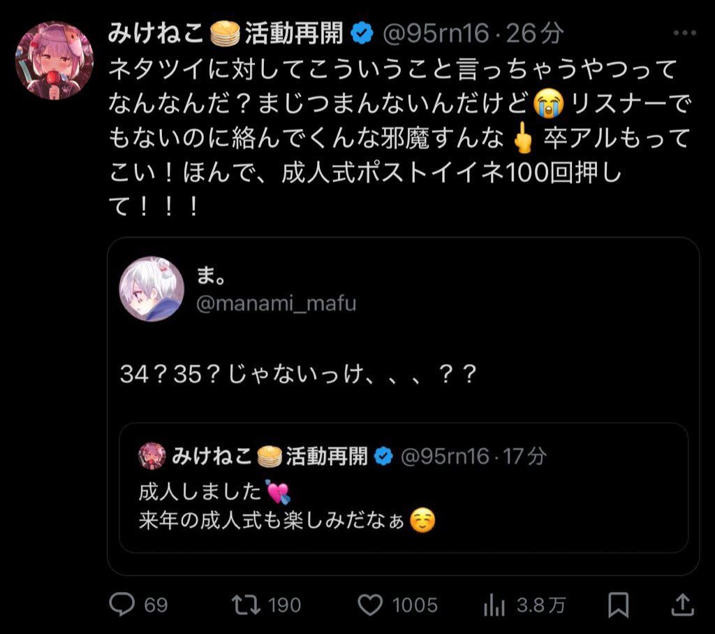 みけねこ「成人しました」リスナー「○○歳じゃないっけ?」→みけねこブチギレ…… 2025/1/14 ゲーム実況者速報 " " 1: ゲーム実況者速報 2025/01/13(月) 19:43:01.39 ID:ybGcu0iM0 マジどした? 続きを読む Source: ゲーム実況者速報