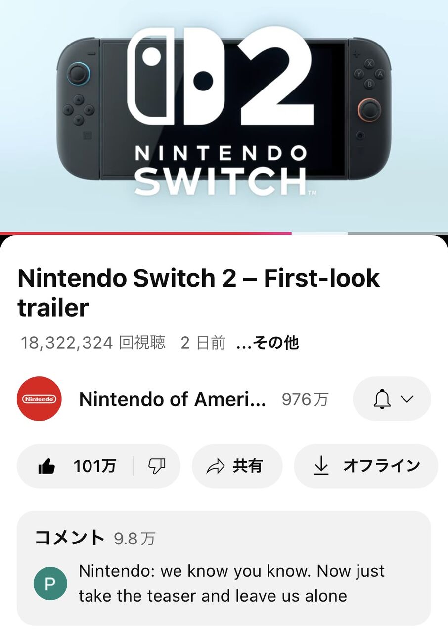 【エグい】ニンテンドースイッチ2さん、初公開動画が高評価100万突破!めっちゃ期待されてるなw 2025/1/19 ゲーム実況者速報 " " 1: ゲーム実況者速報 2025/01/19(日) 10:48:22.12 ID:mDA1k0SG0 凄い 続きを読む Source: ゲーム実況者速報