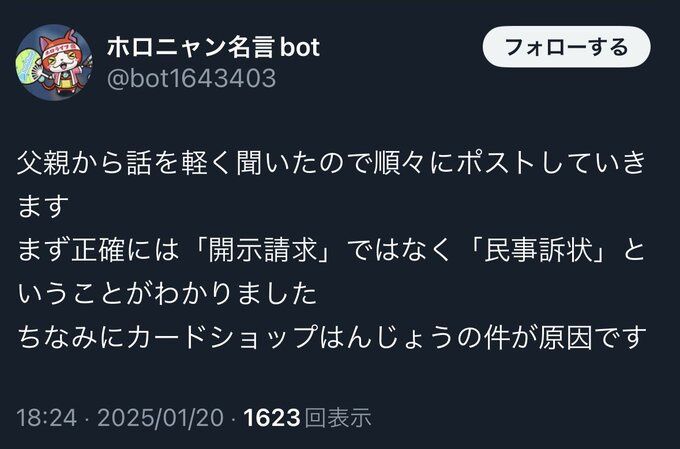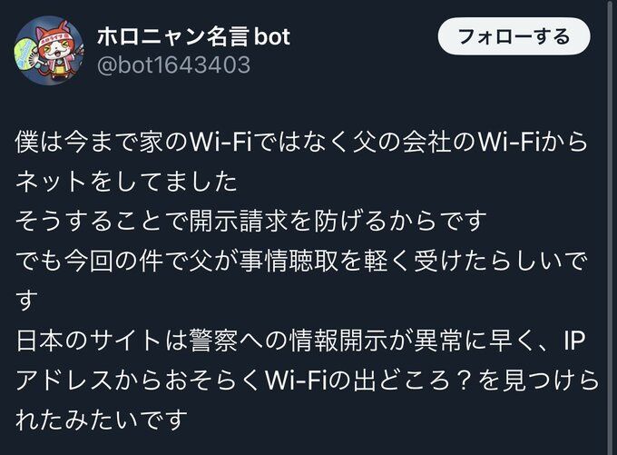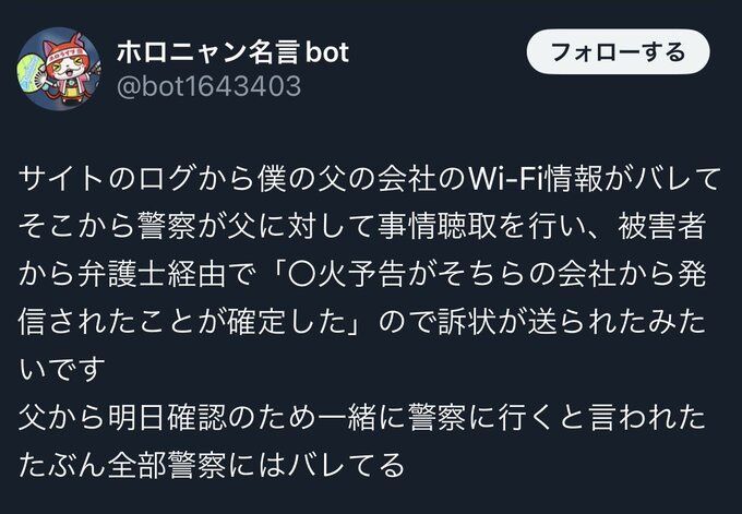 「カードショップはんじょう」に放火予告したチー牛さん、無事開示請求される 「特定されないように父親の会社のWi-Fiから書き込んだ」 2025/1/23 ゲーム実況者速報 " " 1: ゲーム実況者速報 2025/01/21(火) 08:16:04.31 ID:32SqvSnT0 父親の会社のIPで放火予告したからバレないと思ってやってしまった模様 続きを読む Source: ゲーム実況者速報